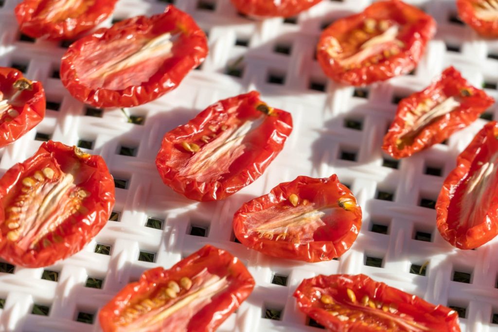 ドライトマトは、夏の強い日差しのもと完熟したトマトを半分に切り、塩をふって天日干しすることで水分を抜き、保存性と旨みを高めたもの。